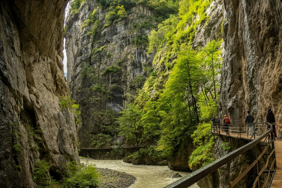 Picture this: you’re walking through a narrow limestone canyon where 80-foot walls tower above you, glacial-blue water rushes beneath your feet, and shafts of sunlight pierce through the narrowest gaps like nature’s own cathedral. It’s dramatic, it’s Instagram gold, and it’s way less crowded than Interlaken on a summer Saturday.