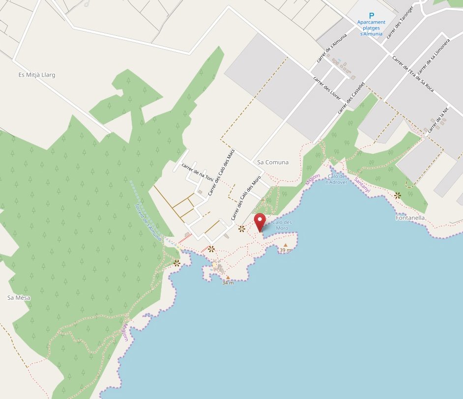 Access : Coordinates:Spain / 39.3137104,3.1215119 / From Santanyi : Leave Santanyi driving along ma 6100 road towards Colonia deSan Jordi.Path/ This road is called Cala Almunia although the name is not visible. It is a two-way road and on the sides there are stone walls. We will follow to the end. There is a fork, we will continue to our left just a few meters. Then turn right onto the first street.