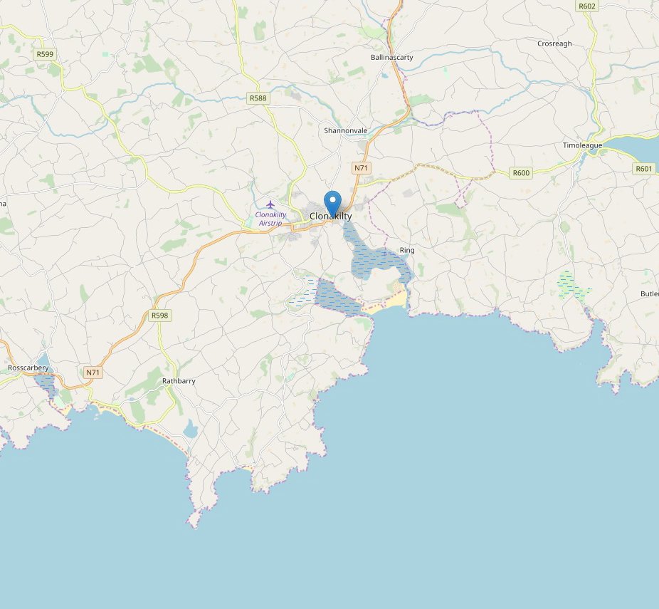 Access : Coordinates: 51.621944, -8.886389 / By bus : The Bus Eireann route 237 connects Clonakilty and Cork several times per day.During the summer months, there is a bus link to Killarney via the N71 road through Skibbereen, Bantry, Glengarriff and Kenmare./By car :  Clonakilty is about a 1-hour drive south west along the N71 from Cork. It is part of the Wild Atlantic Way.