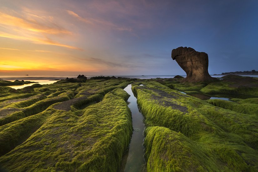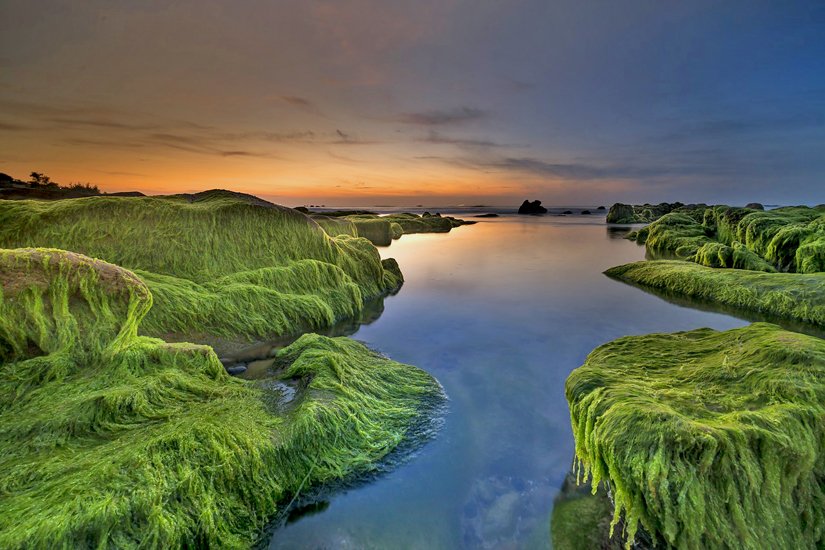 Rock phenomenon is pushed to the shore every day, from past to present. The stone is not only black or gray, but also many colors: brown, yellow, purple, white, blue, pink, red … with many beautiful lines. However, the most interesting sight of the year in mid-March is when the whole rock is covered with a beautiful and unique green moss.