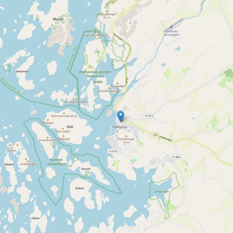 About : In the middle of Fjallbacka lies the 74 meter high Vetteberget. Through the mountain, Kungsklyftan, formerly known as Ramneklovan (The Raven), runs. The gap got its name after Oscar II visited Fjallbacka in 1886. Like many other Bohuslan coastal communities, the old Fjallbacka turns crouching below the mountains towards the sea. The new Fjallbacka lies on the fields towards land and up on the mountains. Outside the coast is the Fjallbacka archipelago and far out in the west lies Vaderoarna.