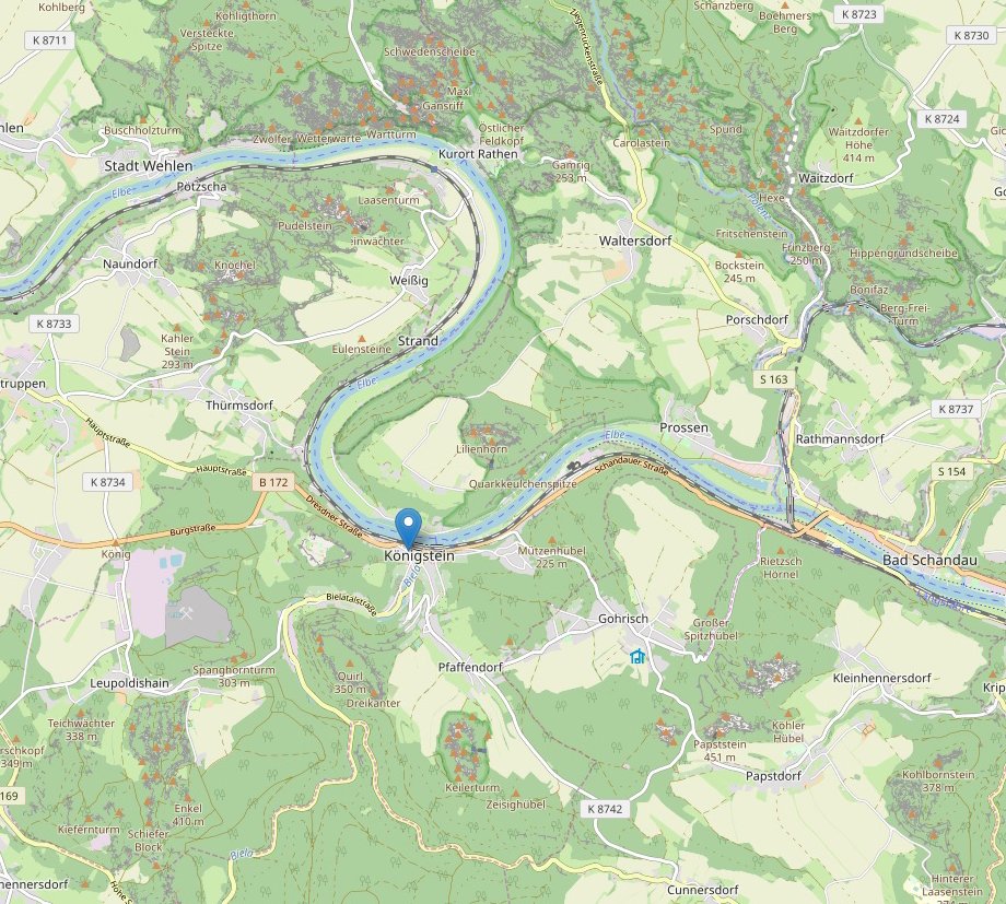 Access : Coordinates: 50.918889, 14.071389 / By boat : From Dresden / Terrassenufer take the ships of the Saxon Steamship Company. By bicycle : About the well-developed Elbe Cycle Route from Dresden or the Czech Republic. / By plane : The nearest airport is Dresden Airport. By train : Long-distance trains go to Dresden Hbf or Dresden-Neustadt, then continue with the S-Bahn S1 to Konigstein. From the Czech Republic one can change in Bad Schandau. By bus : / By car : At Dresden on the A 17 to exit Pirna – from there the B 172 direction Bad Schandau to Konigstein.