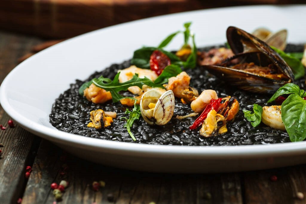 - Black risotto: Made with cuttlefish ink and fresh seafood