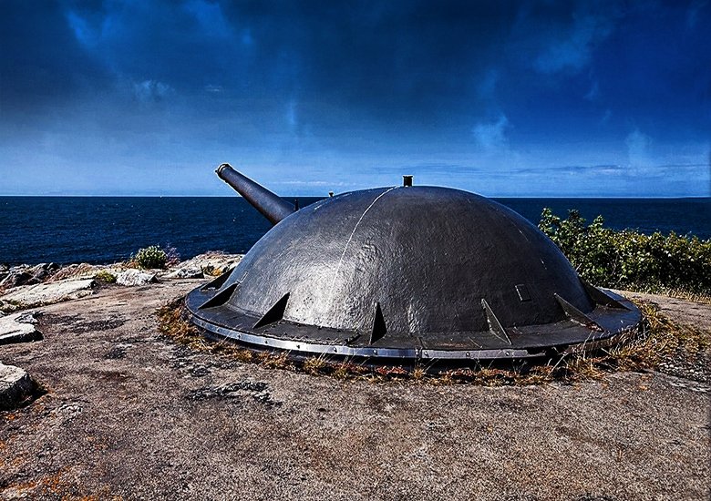 On the island there are partly an older 152 mm battery, official designation battery LO, which was an artillery battery on the island’s southern cape that was in use from 1938 until the end of the 1960s. The battery consisted of three playgrounds, each with a 152 mm  howitzer. The shore battery was part of the so-called seaband line. The batteries were overrun by the nuclear threat and began to be phased out in the 1960s to be replaced by the ERSTA batteries