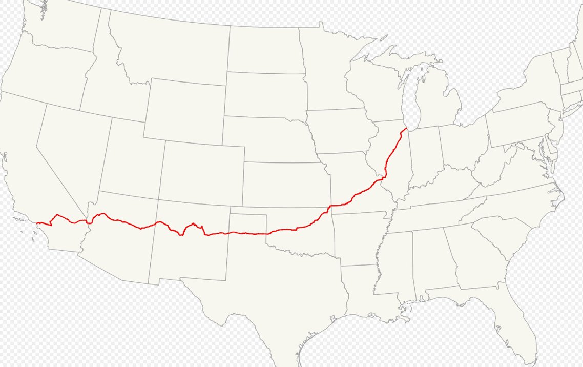 Route 66 (aka US 66) was a historic highway in the United States extending from Chicago to Los Angeles. It crossed much of the American Midwest, Great Plains, and Southwest. Although Highway 66 is no longer commissioned as a US Highway, you can still “get your kicks” on the path it took through the United States as more than four-fifths of it still remains drivable (though not always well-marked) as a collection of state highways and local roads.